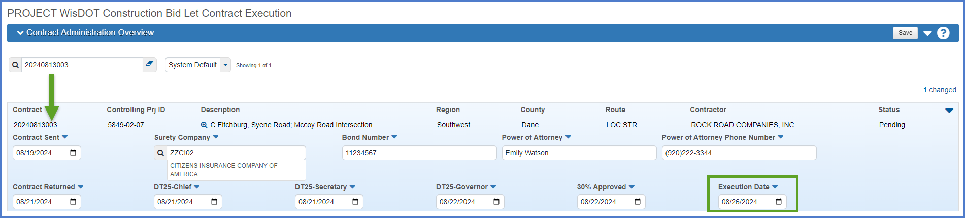 System Event Contract Execution Date Entered: YYYYMMDD### - Contract Description, Project ID in the ?? region has been executed. Bureau of Project Development staff have entered the Execution Date of MM/DD/YYYY HH:MM:SS . The prime contractor will be receivingf the execution letter and contract in the mail.