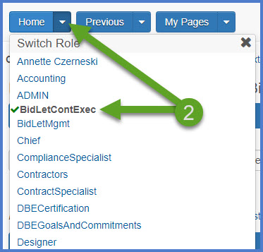 - Select the BidLetContExec role (home button action arrow and select the role).
