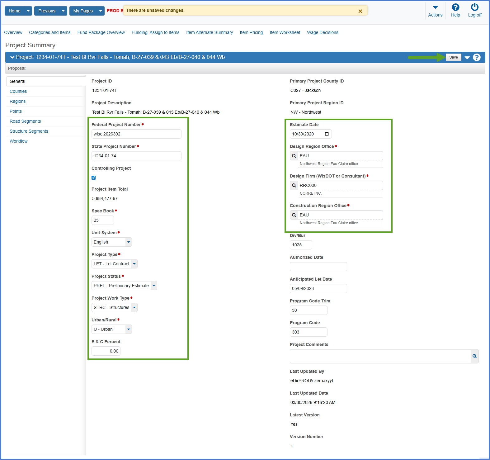 The designer should review and update the following fields on the Project Summary General tab using the field tool tips or the Project Summary Data Fields Table for guidance. Click <Save> when the updates are complete.
