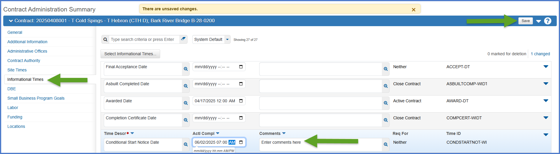 | Conditional Start Notice | Optional | Contract Specialist | Contract Administration |Informational Times tab Conditional Start Notice Date - CONDSTARTNOT-WI |
