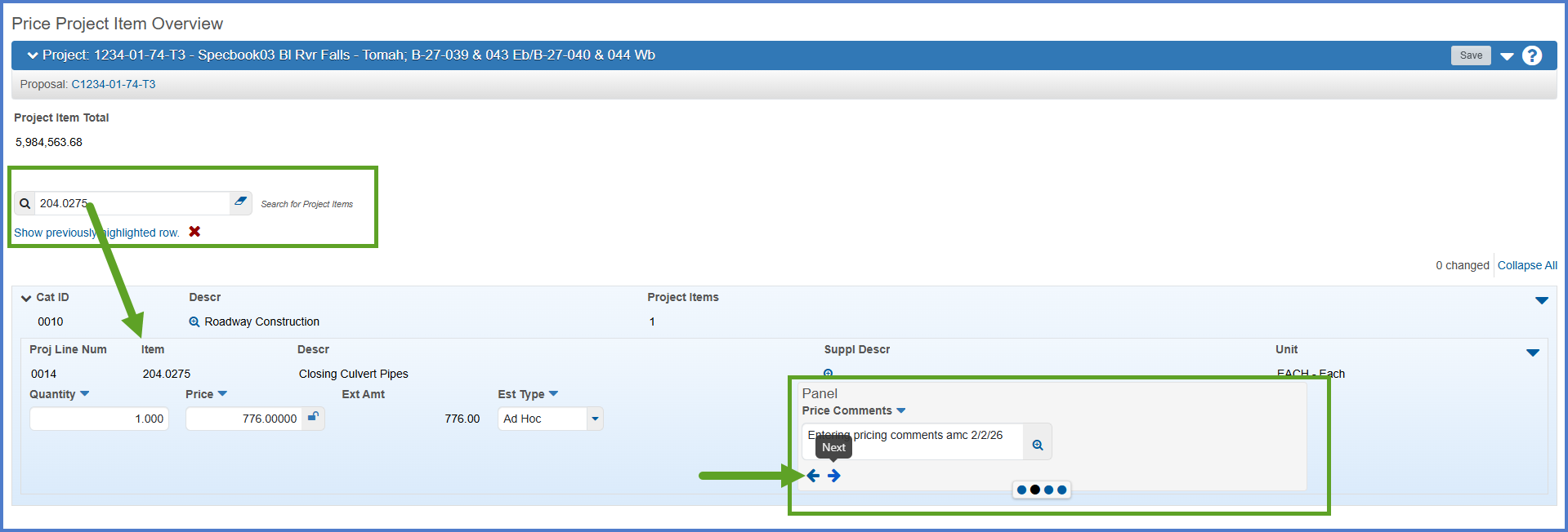 - Use the Panel arrows to access the "Price Comments" field.