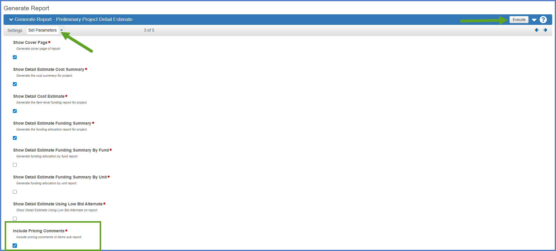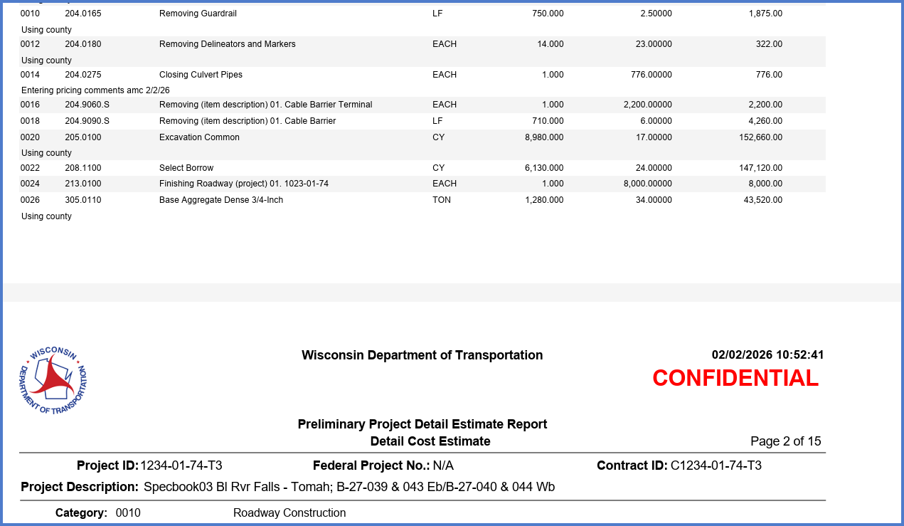 To print the Preliminary Project Detail Estimate with item pricing comments: